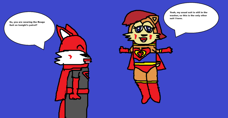 Super Fox seeing Super Squirrel in the Rouge Suit due to her usual suit being washed.