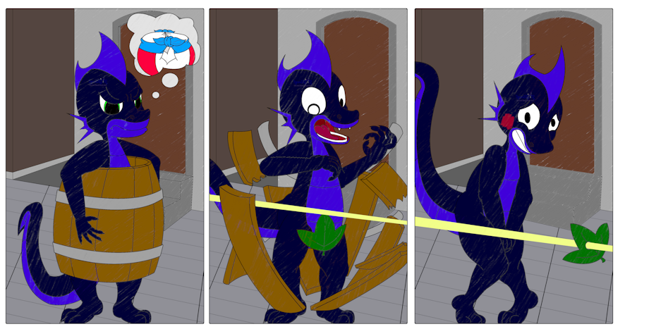 One the leftmost Panel, Parker (a baby dragon with midnight blue scales, indigo colored belly and undertail, with a three-proned fin on each cheek (same color as his belly) and a crescent shaped fin on the top of his head) stands there while holding up a barrel around himself with an angry expression. The background is two buildings with an alleyway between them and a tiled stone ground.