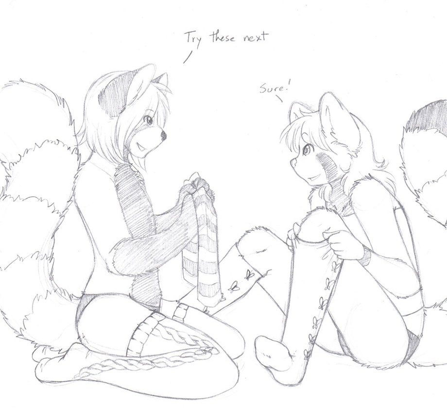 commissioned me to draw a pic of us doing whatever. I couldn't decide, so I did a couple mini-sketches to play around with ideas. We both share a love of socks, so why not?