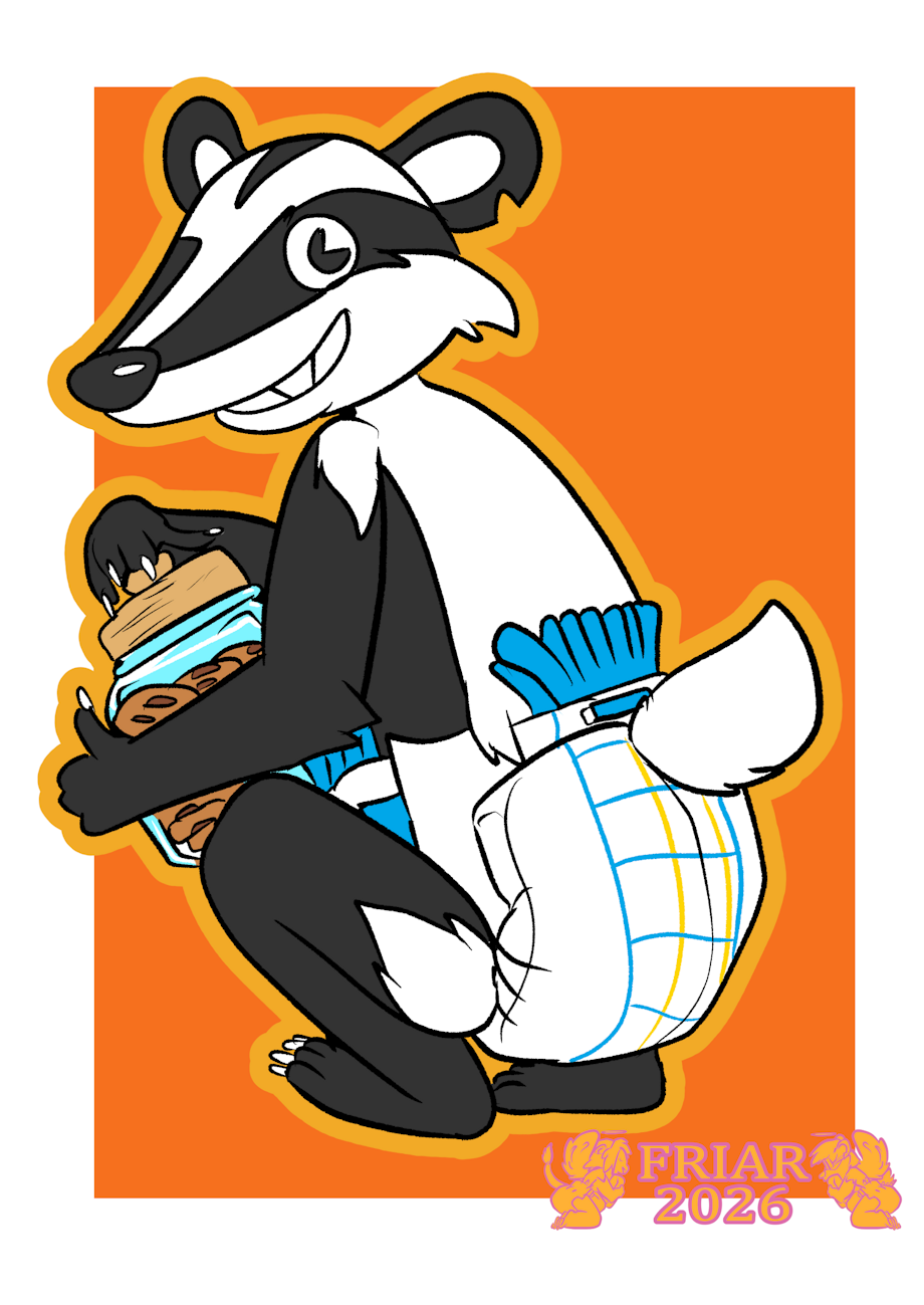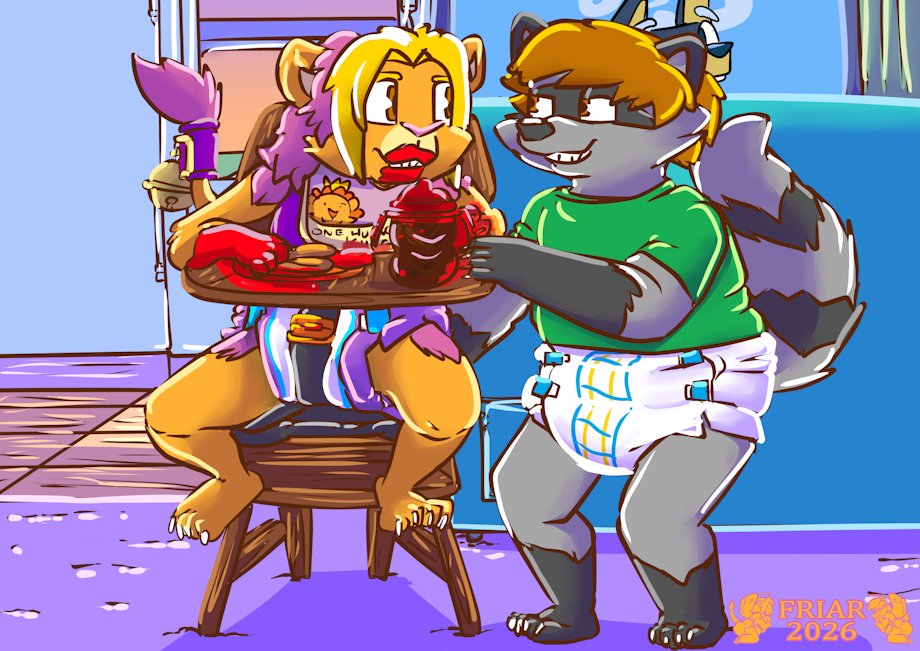 Illustration of Friar the wet and messy diapered lion seated in a high chair eating chicken strips with ketchup all over his paws and muzzle. Tylahn the wet and messy diapered raccoon squishes his seat from behind. Bluey plays on the TV in front of the couch. "Someone likes being messy on both sides, huh?"
