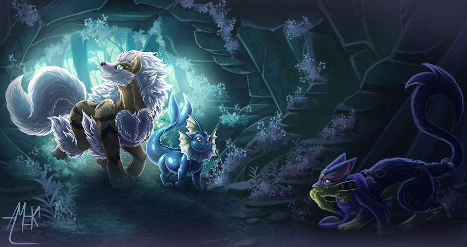 The Arcanine is Celia and belongs to Pearion_Rehtyer and the chubby Vappy is her friend Caffeine and belongs to MartelynnBau. Pearion is also the one who suddenly poked me out of the blue to keep an old promise and pay for this rather great commission drawn by Maralmok ! So thank you for that! Hope I am not scaring you too much :D