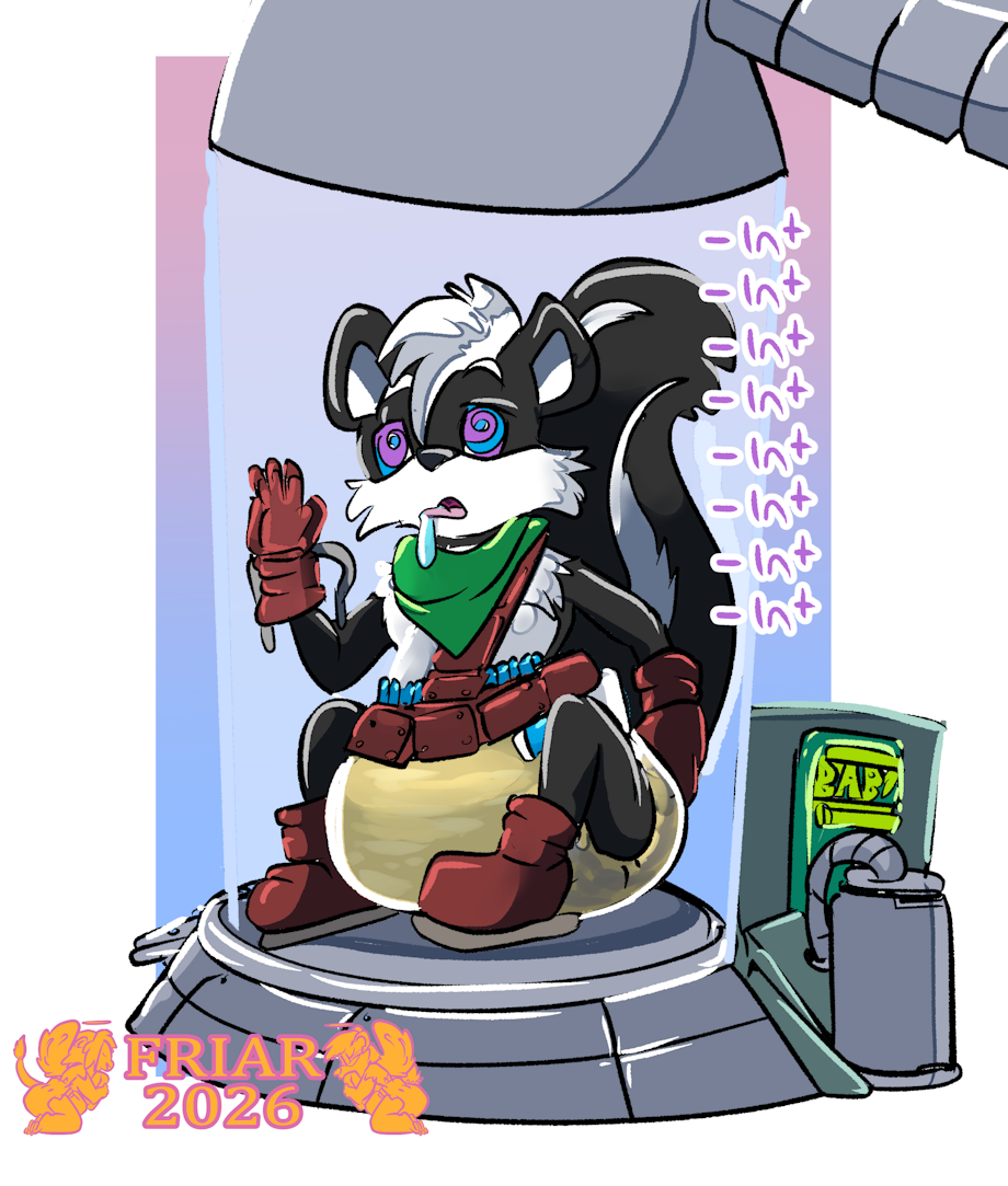 Illustration of Geoffrey St John the Freedom Fighter skunk in a brain drain machine mentally regressing him as he drools over himself in a large diaper.