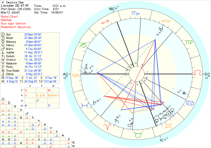 Both of Dee's parents believed in astrology. So much so, in fact, that they worked out what would be the most auspicious natal horoscopes that would be feasible for their offspring, and then worked to arrange to have their children born at those times. Including arranging to (safely) induce Dee's birth when she showed no sign of arriving on schedule.