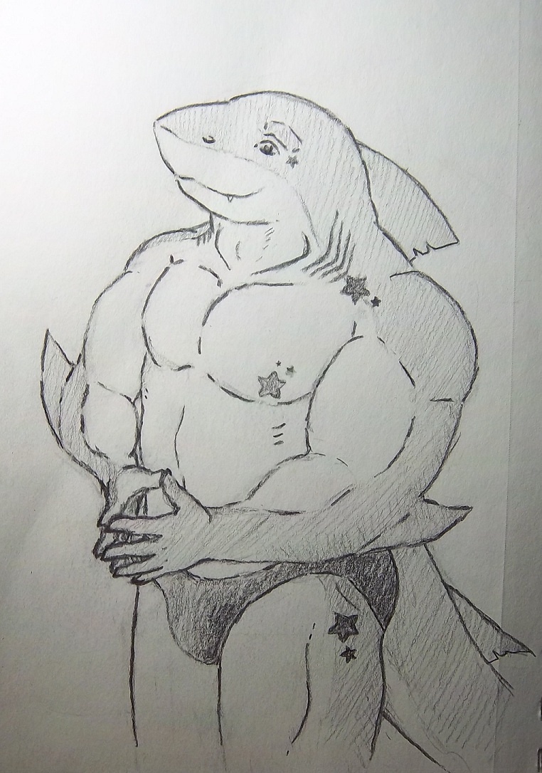 This polite and well mannered fellow enjoys snuggling, long walks on the beach, and ripping off the flesh of assorted animals. Well, maybe not that last one. I like my buff guys to be cream-puffs on the inside. Anyway, this was a fun one to do. Never tried a shark before, but a certain friend of mine pushed me into it. In short, I really like it, and I will be drawing more sharks from now on.