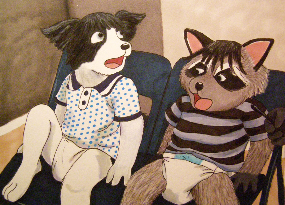 Commission for Skunktronix of his fursona, Scooter, and his favorite plushie.