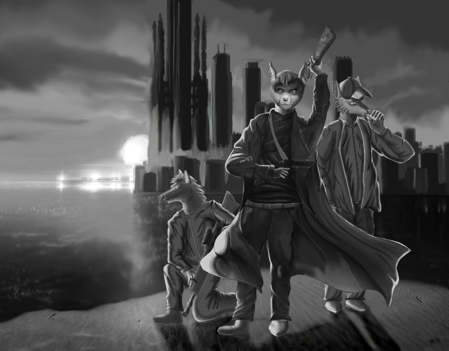 Psycho-Pass (an Anime) name is a play on the Japanese pronunciation of the word "psychopath" and this image is meant to be as it is a furry representation off of the anime off that series. The background is Japan around the year 2113 or so, the characters seen are stand ins for the anime characters as follows: Left, Luca holding an assault rifle a stand in for Mido as a killer sure Luca is different but has some similarities. Right with the cigarette is Jacob in this case Standing in as Rikako, yes it is a male standing in for a female, but like a lot of persons, he is only a pawn anyway. Center is the ring leader Emil picking up a shotgun from behind his back is standing in for Shogo who like Shogo, Emil is very methodical. Made for a friend on FA Stealthdragon91 with his characters,
