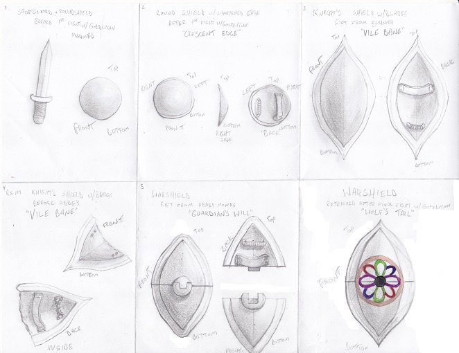 Here's the progression for Hethkar's weapon choices, starting with sword and shield and going through to the warshield, and to Wolf's Tail (which, being a sentient weapon capable of changing shape to serve its wielder, is also a warshield). The retrieval of Wolf's Tail is nowhere near the end of Hethkar's story, but it does mark his achieving the peak of his power. The seal on it is the Eternity Seal; I'll leave the significance of it being the only thing I colored and not having its own shadow to your imagination for now. xD