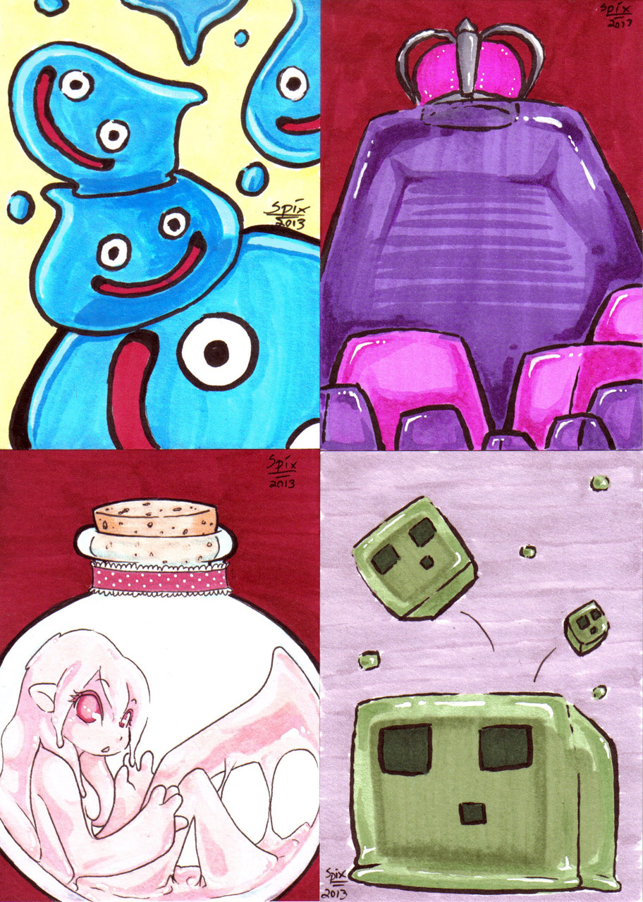 I started doing a bunch of Artist Trading Cards (ATCs) because I have this pack and should probably do them. The problem is I love them so much I don't want to trade them with anyone! Slimes are so wonderful, how can I give them away?