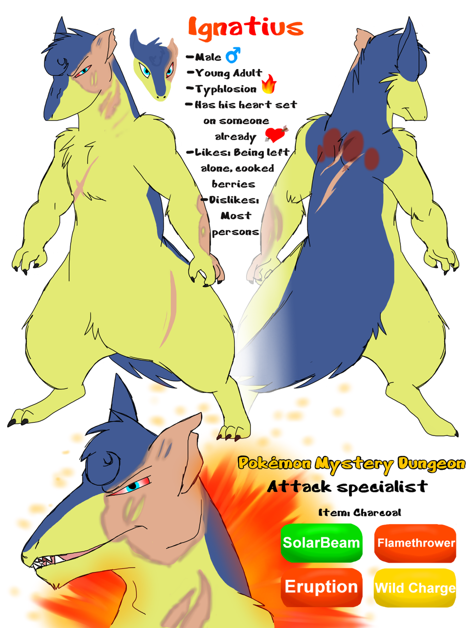 My girl made this for my pokesona named Ignatius, as you can see he's a typhlosion. I never thought my pokesona would be badass but she pulled it off yet again, making him look like a total boss. I absolutely love the fire on his back aswell as how his scars turned out (story might be coming about how he got those >.>). Thank you love, for helping me design this pokesona and by spoiling me so much with drawings, you're too much for me, I love you hun!