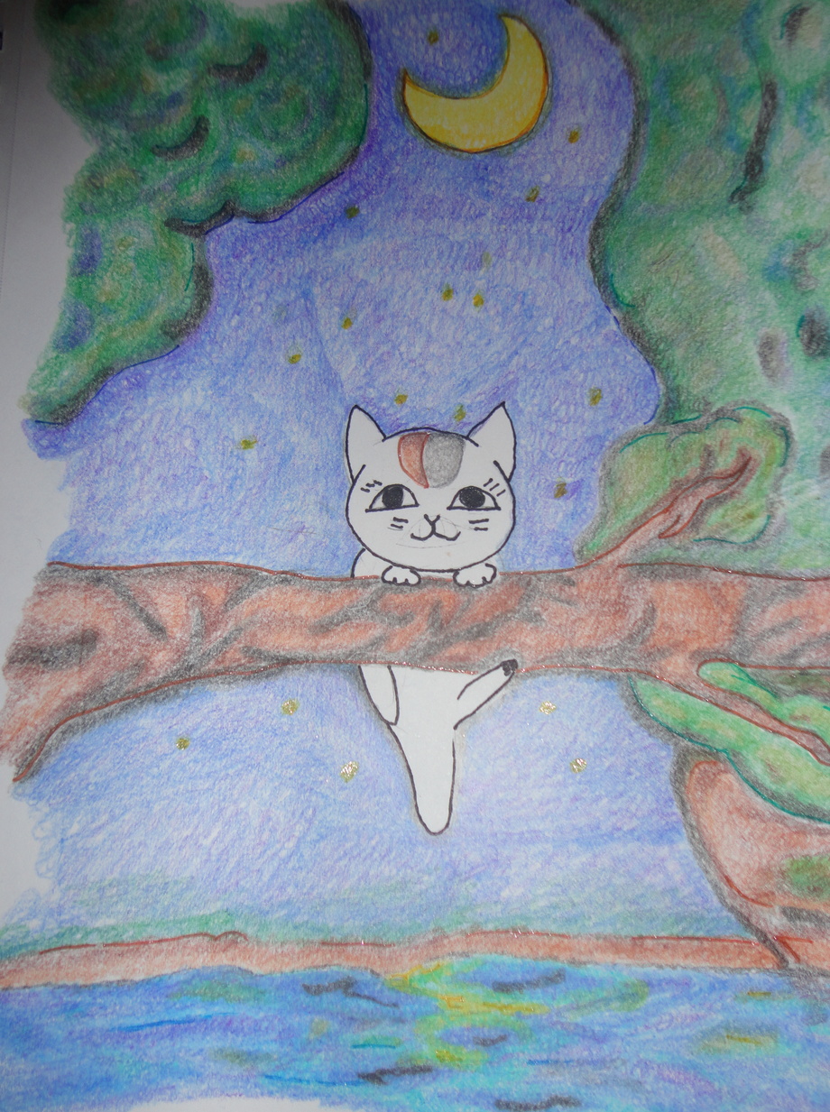 Nyanko is climbing a tree, but didn't predict the limb would give from his weight, so now he's hanging on while the moon comes out and the stars shimmer down on a very nice night.