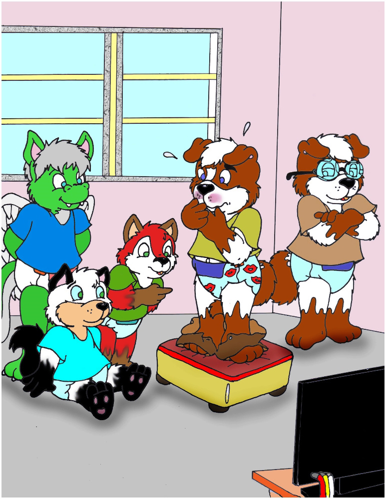 Daaaaaaaaaaaaaaaaewwwwwwwwww look at sammys diaper I love kisses designs on them grey adowable I love this pic Nelson remi looks a little jealous back there doesn't he. Dragore,Robert and Foxy are like wooooooooooooooooow Sammy is like so cool were did ya get your cool diaper from I wish we had ones like that remi thinking to him self:what a show off he is. YAAAAAAAAAAAAAAAAAAAAAAAAAAAAAAAAAAAAAAAAAAAAAY LOOK AT MY DIAPER SPANKIES!!!!!!!!!!!!!!!!!!!!!