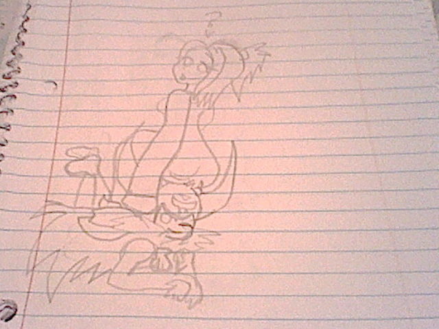 I drew this as an inside joke because of what happened between Kristen and Kayamba when Kristen played on her file this afternoon. She was trying to get Kayamba and Cha-cha's Chum-chum level up, so she went and accepted a Guild Quest to slay a Rathian. Well, from what I saw, the Rathian had tackled into Kayamba and Kristen, and I don't know how, but the Rathian made it look like that Kayamba had Kristen sit on him! XDD And for some reason, no matter how many times Kristen kept pressing buttons to get her and Kayamba unstuck, Kristen couldn't move! Needless to say, she failed the Quest, but it was so freaking hilarious! It must have been some sort of glitch or something, but it was funny!