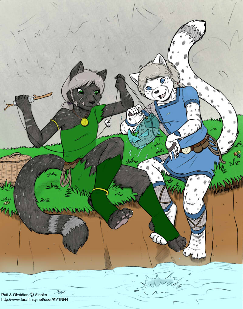 Obsidian Ironrose - is a white furred male with light grey spots and stripes, his eyes are a deep azure blue (he is mostly feline with canine traits) Puti Ironrose - is a black furred female with dark grey spots and stripes, her eyes are a bright emerald green (she is mostly canine with feline traits)