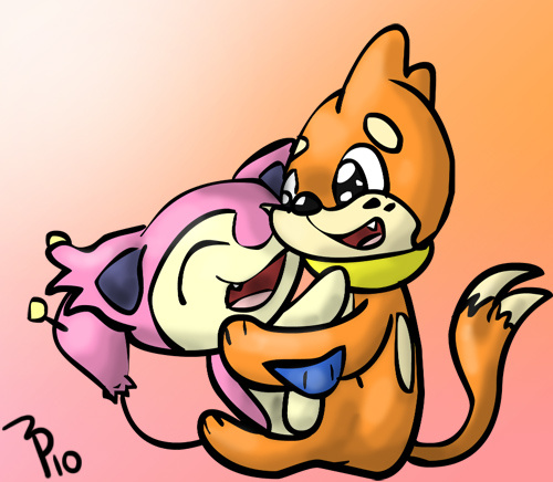 Yeah, I drew this a little while ago for bbuizel's birthday because the poor guy said he didn't usually get much celebration or fanfare. That stinks! After everything he's been through, I wanted to do something nice for him, so I went ahead and drew him with a Skitty (who's supposed to represent a certain someone X3), hugging each other and enjoying the day.