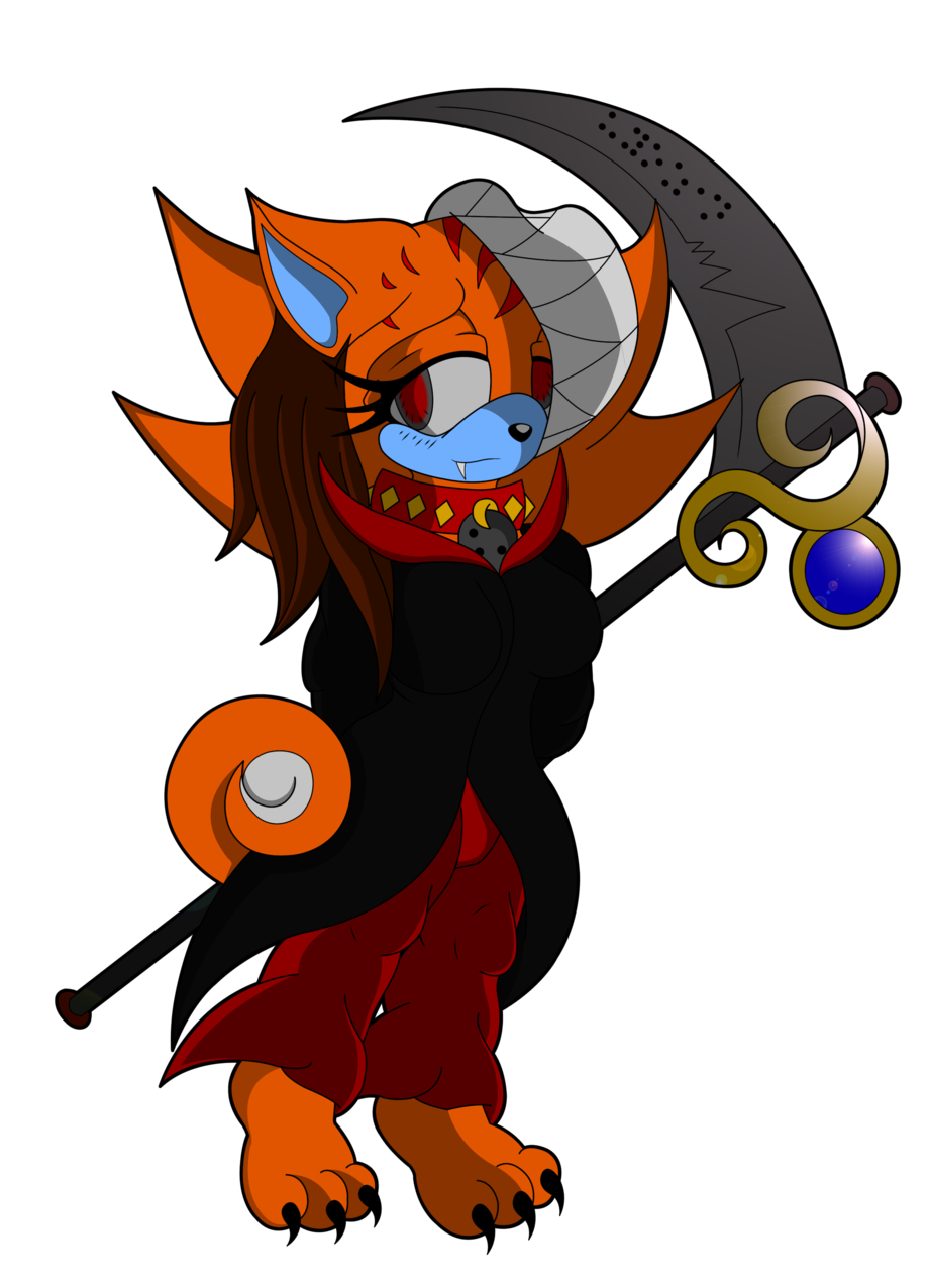 Orangeish Fur, Cold blue Skin, Quirly Tail, Bandage on head