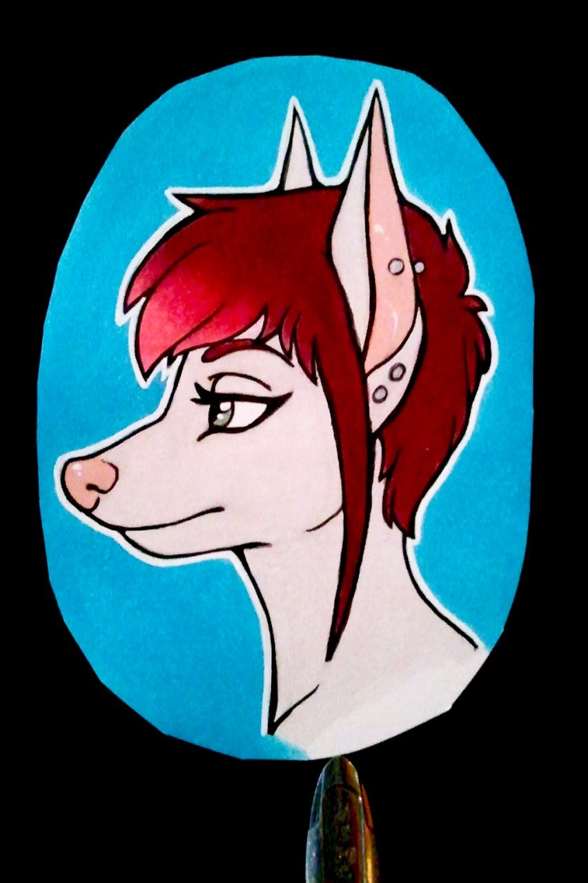 Profile of my white Doberman character Ember that I turned into a badge. I wanted a plain character to balance the obnoxious blue spacedog Comet.