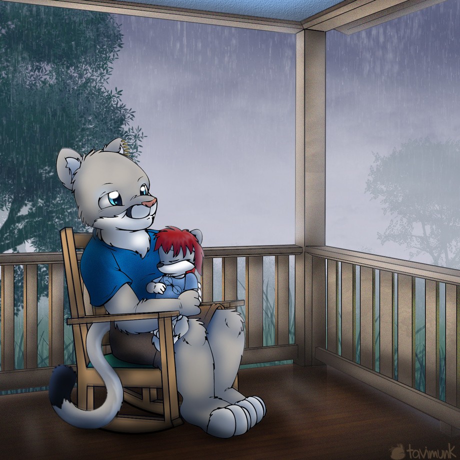 the rocking chair, while holding the otter pup in his arms. Flen was