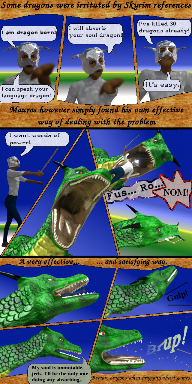 In all seriousness though, I'm bored of seeing repeated talk about games where dragons are an enemy. Skyrim doesn't even make sense, why would one with dragon blood go murdering those he shares blood with... oh yeah apart from the game mechanic -..- Yes I like dragons, and that is why I DON'T like Skyrim. Why can't I play as a dragon and kill these dragon hunting fools...