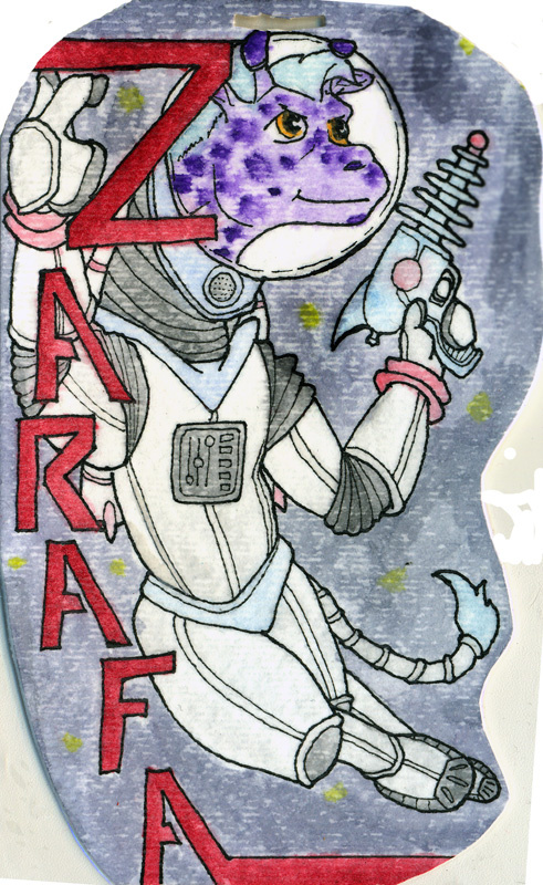 One of those badges I used to do all the time! Watercolor painting, of course. This one is Zarafe, the purple giraffe, who will be at Califur this weekend