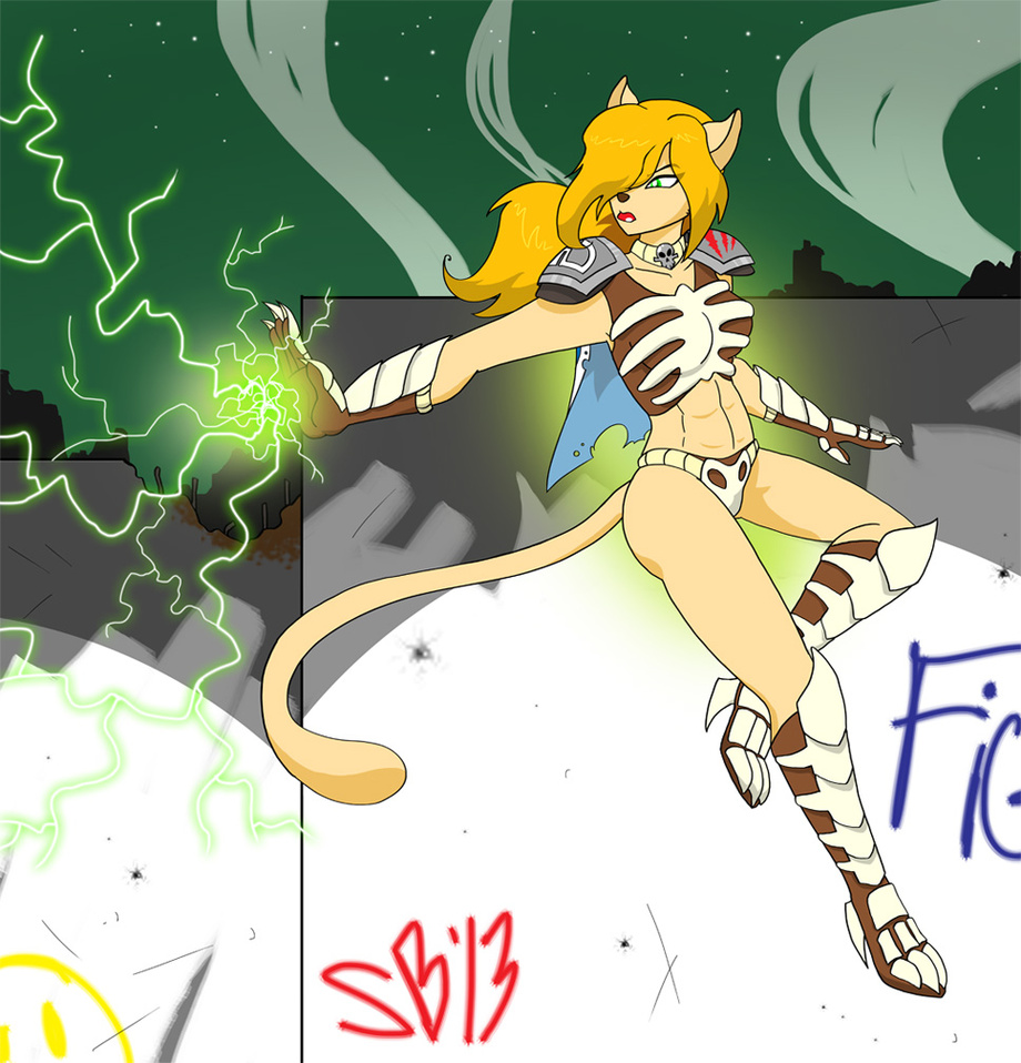 The second part of flafty 's commission. Leona is another member of the futuristic gladiator team. She wears lighter armor and (I hope I have this right) seems to have electrical and teleportation powers.