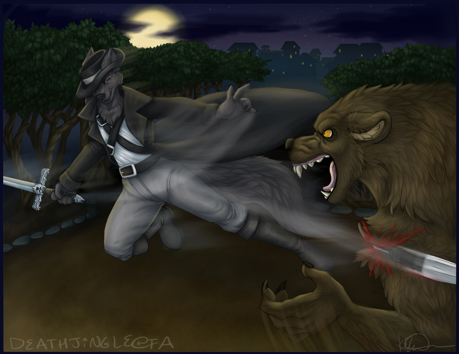 A full digital paint commission for ucrodevil, also featuring a werewolf of mine, Mordekai. Mature for omgblood.
