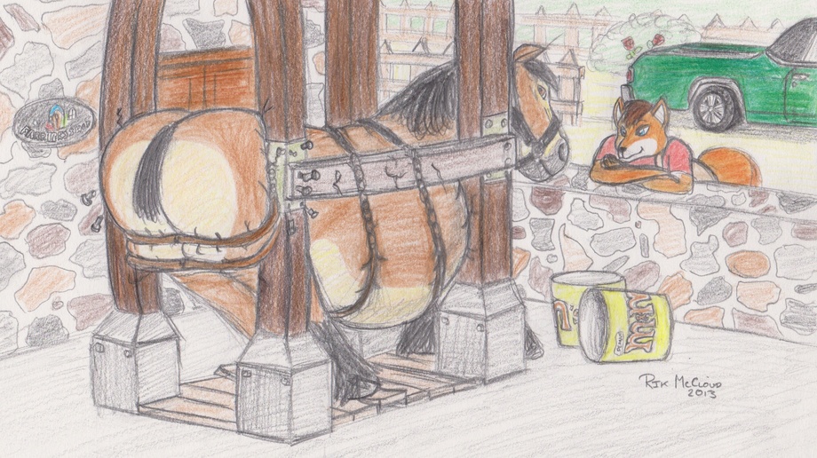 Basically the hoss needed re-shoeing and so squeezed into the stand. To help him keep his mind off things as he was a bit nervous, a certain fox gave him his favourite sweets to keep him happy. As a result, it's meant leaving is going to be tricky...