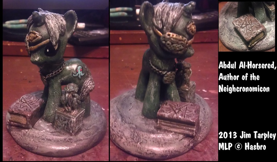 Al-Horsered was a mad poet from Saddle Arabia circa 500 BC (Before Celestia) who wrote a book of ultimate evil known as the Neighcronomicon. A tome of hideous secrets learned while wandering the great Saddle Arabian Desert, visiting ancient forgotten cities and trafficking with evil beings and secret societies. He finally met his ultimate fate by being seized by an invisible monster in broad daylight and devoured horribly before a large number of fright-frozen witnesses. The Neighcronomicon currently resides under lock and key in the occult section of the Miskatrottic University library.