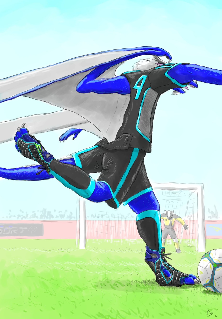 So here, have a dragon guy about to boot one into the opposing goal. As well as a new paw-wear design for the sporting dragon! The kit isn't meant to be represent any specific real-world team, just the sporting colours I'd probably choose if designing my own, though they do bear some resemblence to the secondary colours used by England during Euro 2012.