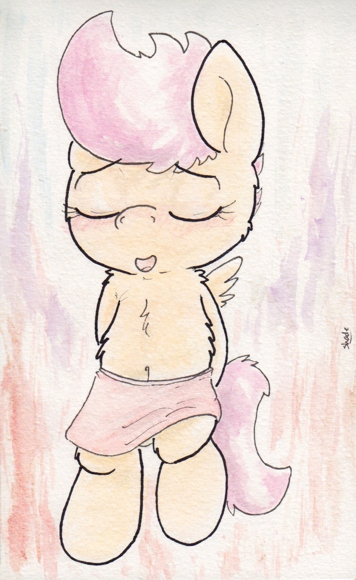 Here's a slightly bipedal Scootaloo in a skirt having happy thoughts.