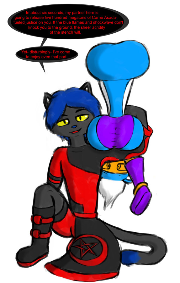 Nate and Leila, also known as Black Mage and Blastcannon. The former is the son of a dark, evil wizard, raised by the superheroes to use his powers for the greater benefit. The latter is a shy skunkette who is very embarassed of her staggeringly effective powers. Nate's trying to bolster her confidence. :]