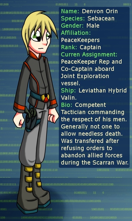 Biography: Born to one of the PeaceKeeper inner worlds Denvon was raised to see PeaceKeepers as paragons of Sebacean virtue and a shining beacon for other species to grow towards. With this ideal in mind he linisted when he came of age and proved himself a competent officer rising through the ranks gaining the respect and loyalty of those beneath him viewing their lives with importance. As he rose through the ranks he saw the disparity with how he had previously viewed PeaceKeepers and how they often acted. It was his endeavor to change this. His ease of relations with other species landed him commanding a joint fleet of PeaceKeeper and Luxan ships during the Scarran War. During one attack he was ordered to retreat and leave his Luxan allies to die. He refused strategically positioning his ships assisting the Luxans and allowing for both groups of ships to escape with losses fewer than would have been sustained had the Luxans been destroyed. Still this refusal to obey orders saw Denvon reassigned to the Hybrid ship. He has thus far performed acceptably with the Scarran Captain though initial relations were rocky.