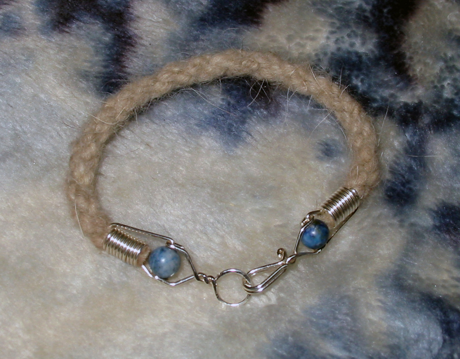 This is a Gray Wolf Hair Bracelet with Denim Lapis gemstones. =3