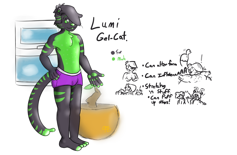Lumi is a beautician and resident in my little cannon universe containing Owen and Francis. Through a few unclear incidents, he managed to turn his form to a gel-like being with a thick, gooey mixture of aloe and mint. With such a physical form, he tends to get up to a few expansion related things with a tendency to fill himself or others with himself, via that multi-purpose, rather stretchy tail.
