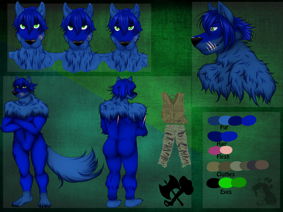 Hight 5'6" Artium has a dark and light blue colored fur and light green eyes as well as black claws, he has several scars 3 on the left side of his muzzle, 1 going down his spine, and 1 on his right shoulder. He also has a. Ax and hammer tattoo on his right wrist.