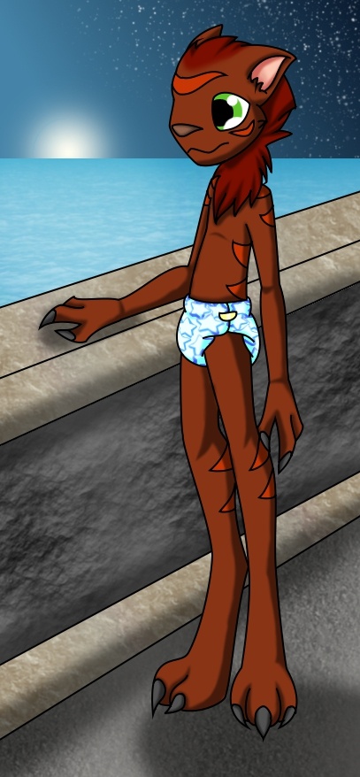 Jex smiled walking out onto the stone deck behind his home. It was early evening and the sun had still yet to set below the see that stretched out before him. He always kind of liked the twilight hours seeing the sun mingle with the stars. He sighed as he thought about those points of light. His keen eyes could make out their colors and even tell which were binary. He'd been studying them a lot and hoped to one day get a job aboard a ship. Though he wasn't sure just yet what position he wanted. Medical seemed appealing as he liked helping people. His skill at Nest Ball certainly showed he had the strength and agility for security. And of course every ship needed plenty of techs. Jex smiled as one hand fliddled with his mne which was just coming. He still had years to decide. For now High School lay before him. Dances, dating, concern for the latest fashion in his diapers. Granted the second one wasn't quite as common. Jex liked his diapers though. It was sort of an old tradition with those from the Southern Jungle. While others might show off this or that style of loin cloth or a new poncho he did the same with his diapers. It wasn't much different. At least not to Sheeka or Sokee for that matter. The couple he'd met had complimented his. Jex laughed and toyed with the idea of maybe being a model for some Sokee diaper brand as he watched the sun set floating away for at least a bit on daydreams.