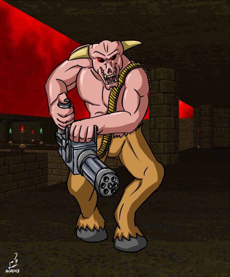 I used a basic minigun for reference. I assure you that he's got the thumb on the trigger ready to ruin DoomGuy's day.