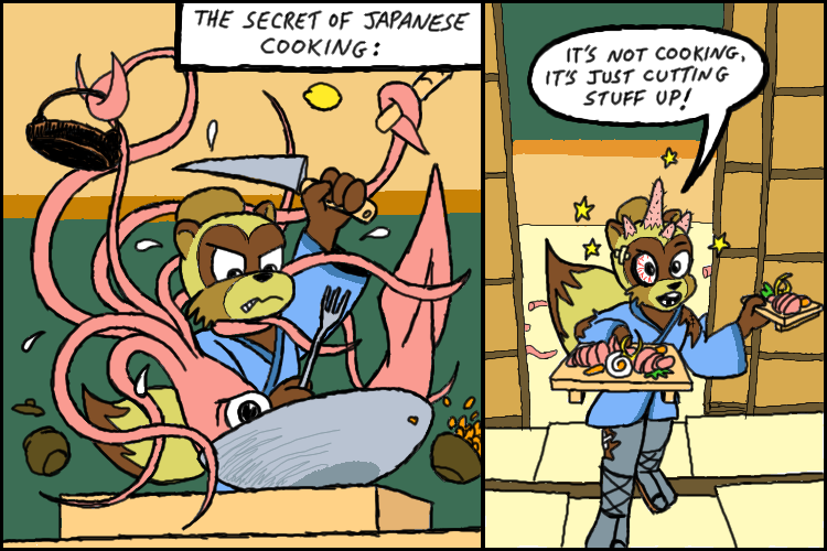 Pretty awesome. From the low POV angle with the squid's distressed expression contrasting with my ganbatte grit, through the cartoony action of things flailing and flying about. LOVE the sub-orbital lemon at top! I shudder to think where its unseen 8th tentacle is, knowing his previous webcomic "Tyrannosaurus Sex": hope already "on the cutting room floor" in panel 2. And the details: from shoji screens & door, tatami mats, geta serving-boards down to his tabi socks! And hey look, despite the corrected tanuki tail he used to fret over, I'm a unicorn now!