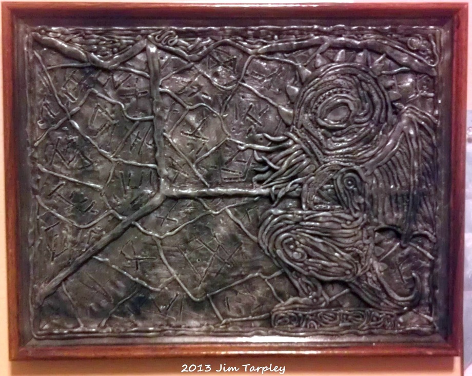 "The bas-relief was a rough rectangle; obviously of modern origin. Its designs, however, were far from modern in atmosphere and suggestion; for, although the vagaries of cubism and futurism are many and wild, they do not often reproduce that cryptic regularity which lurks in prehistoric writing. And writing of some kind the bulk of these designs seemed certainly to be; though my memory, despite much familiarity with the papers and collections of my uncle, failed in any way to identify this particular species, or even hint at its remotest affiliations.