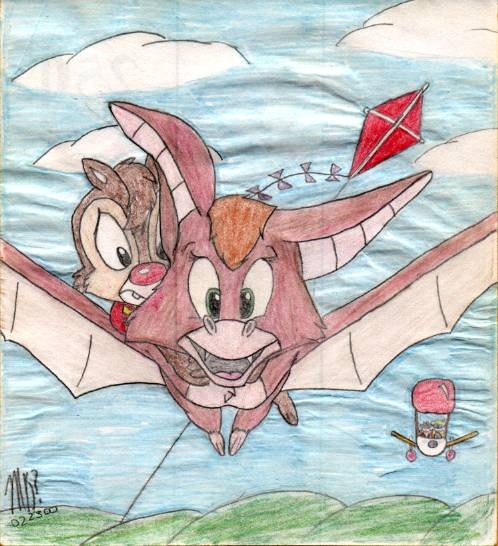 Love Dale 'n Foxy's expressions here. Any picture with them is adorable since they're such an effervescent pair. That, and I had fun drawing tiny Chip & Gadget in the tiny Rangerplane.