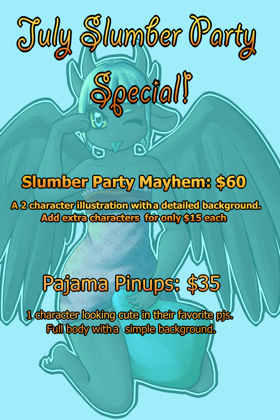 Place your order here: https://docs.google.com/forms/d/10uwD-LreIQu9e_OnVhQjxW... Slumber Party Mayhem: $60 2 characters enjoying a fun filled slumber party, with a full colored detailed background to match. Invite more characters to join the party for only $15 each. Adult/erotic content is allowed Normally would cost $80 and $20 per character. Slots: 3 1)Taken 2)Open 3)Open Pajama Pinups: $35 1 full body character sporting their favorite pajamas, they cannot be completely nude but you can opt for see through pjs. NO erotic content allowed Normally would cost $40 Slots: Unlimited