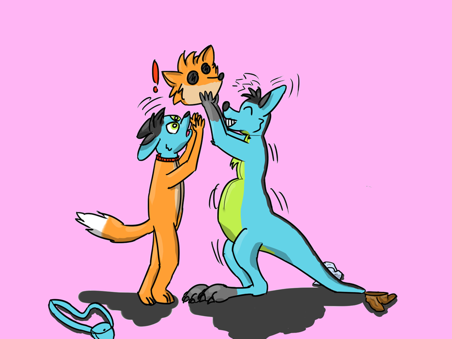 Groo-fox eventually falls, his legs being hold off the ground a bit as the pants are put onto him. dave-roo helped Groo into the shirt as the fox lied there on the ground. dave snickered and picked up Groo's blue pouch bag, and promptly put it on, smiling extremely happy down towards the fox. Groo sits himself up, looking back at dave in 'his' body with a look of sorrow with jealous frustration. ~