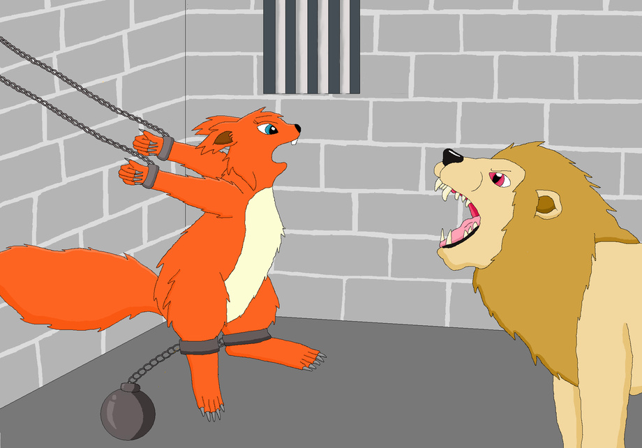 poor squirrelette is chained up in a cell with a lion