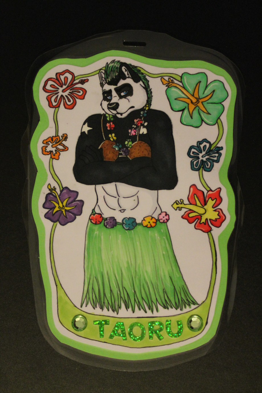 A traditional badge for aysel that I finished up last night while out sketching. The EF theme this year is 'Hawaii' and aysel does not like hawaiian themes, so he wanted his panda character in the most hawaiian outfit being all grumpy about it! haha