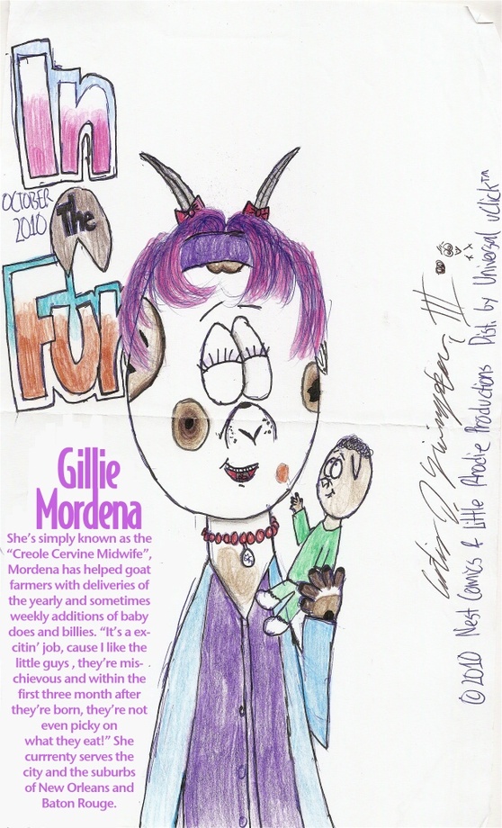 "Salut tout le monde! Sorry my Cajun side had kicked in... ana' who, Gillie Mordena, Had a busy day, one goat farm near New Sarpy had an overload of new kids and I was warped! While I was there, I've met on of the kids, Charlot, was already 25 months old, yet, he was soo cute, he threw his applesauce near my cheek. That was le point culminant de ma journée! (What I said was 'the highlight of my day!' Here I go again!) I love my job, Always random! (or should I say, 'très aléatoire!')"