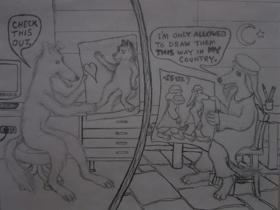The poor dog on the right isn't allowed to be as creative and daring as his Netherlands, other Western European, U.S., Japanese, and Canadian friends. Doing so in his country will get him stoned to death.