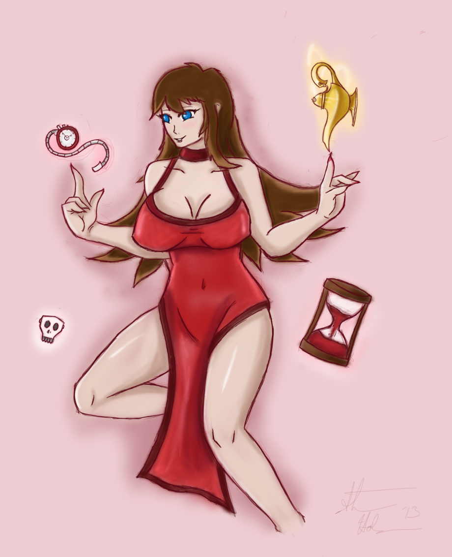 This is a Sketch commission of Mistress Roberta [derp] Very simple, showing her off in her iconic Red dress as she is surrounded by the 4 symbols of her magical abilities-a Pocket Watch [Hypnotism],a Genie's Lamp [Magical Ability], an hourglass[Time Distortions/Manipulation] and a small Skull Charm [Manipulation of the dead and undead].