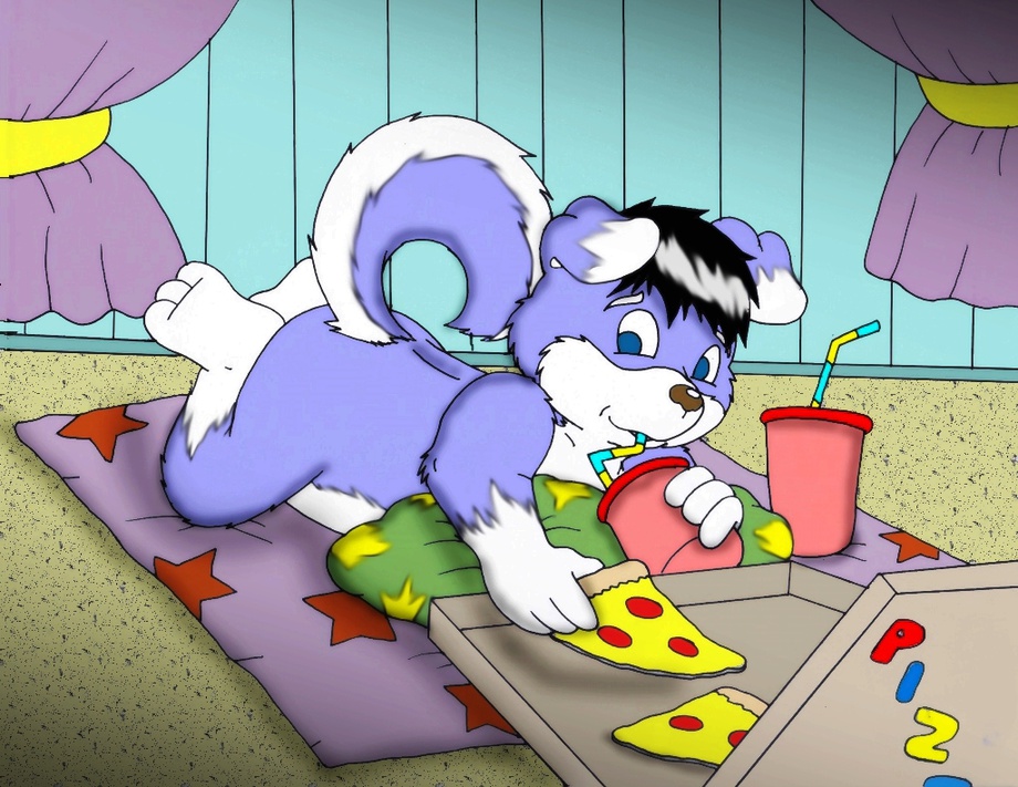 This pup is enjoying great delicious things! Can I have a piece of your pizza?^^