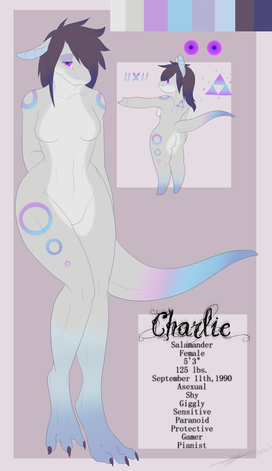 △ This is Charlie, the shy, sensitive salamander girl who likes to read, play the piano, and spend the night gaming. She's very sweet and is too soft spoken to tell you if she's angry or doesn't like you. Charlie is very easily embarrassed and has a hard time taking compliments, if you call her cute she's more likely to blush, make weird noises and go "Nooo, you're silly~" than flat out say "I know.", but it's just her way of saying thank you. Though Asexual she does find they occasional male cute or attractive but she doesn't have any sexual urges.