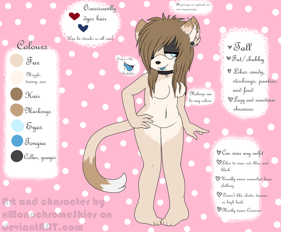 She can wear anything, but mostly tank tops, corsets, skinny jeans, shorts and stockings, and modernized pinup/vintage clothing, and she loves stripes, polka dots, gingham print, floral print, lace, checkers, hearts, and stars.