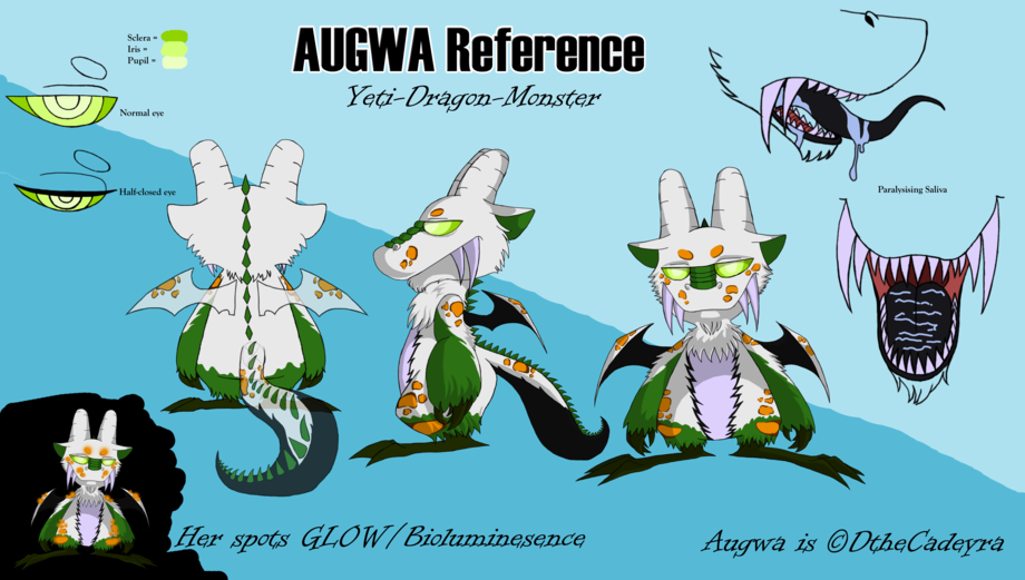 Augwa is a fairly scary monster but has a friendly personality. Her main diet consists of fruit. She can't smile because her huge back molars have grown out into downward tusks. She can speak normally.